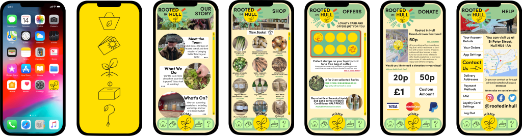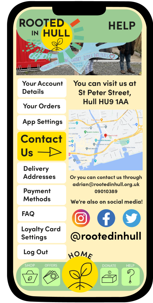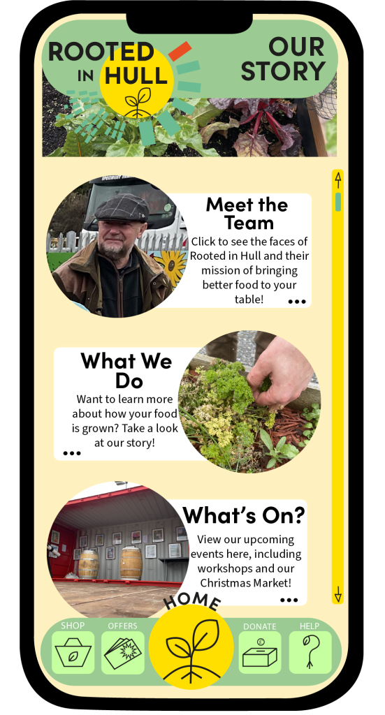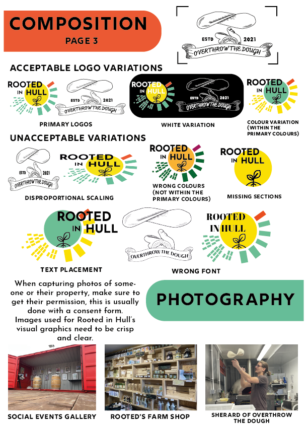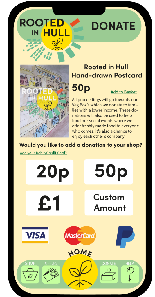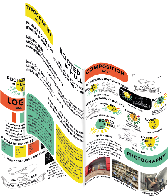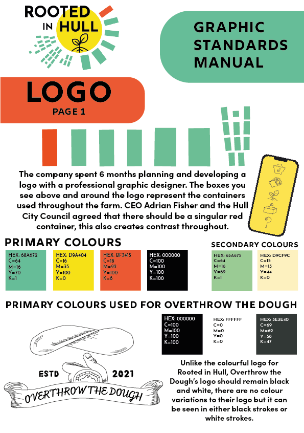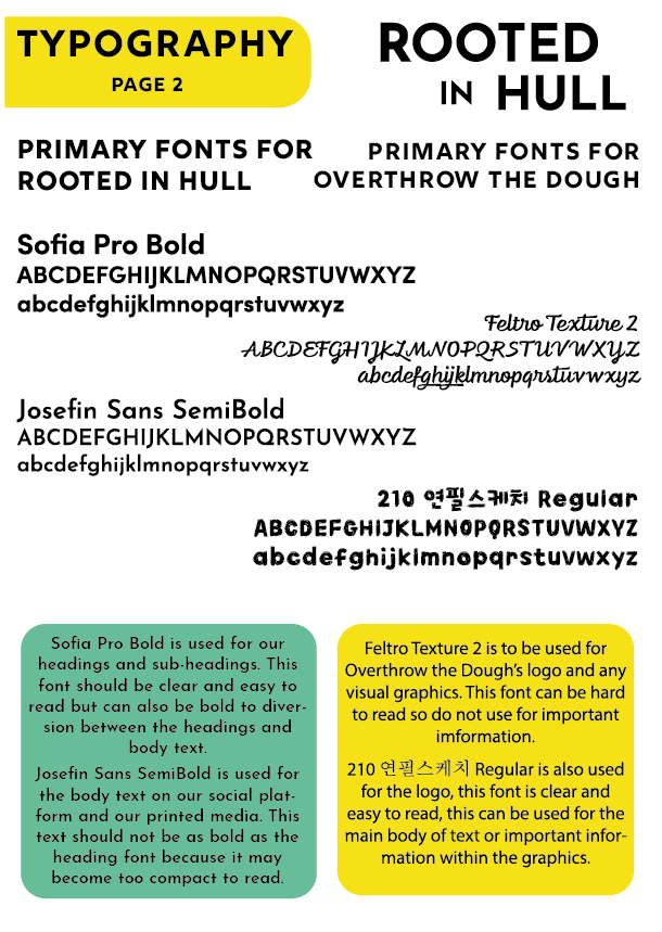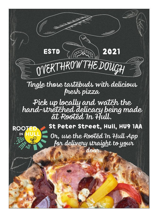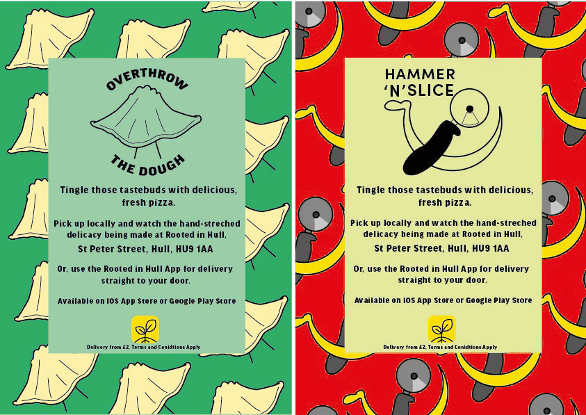 These are the first rough designs of the flyers, both flyers have the same structure, text, and fonts. The ‘Overthrow the Dough’ flyer includes both the coloured variation logo design and the black and white one. Green tones have been used within this flyer to incorporate Rooted in Hull and their urban farm aspect. The ‘Hammer ‘n’ Slice’ flyer has yellow and red colours to represent the revolution aspect stated in the brief. The repetitive background on these flyers makes them seem youthful and playful with the use of colour which will attract the younger generation.