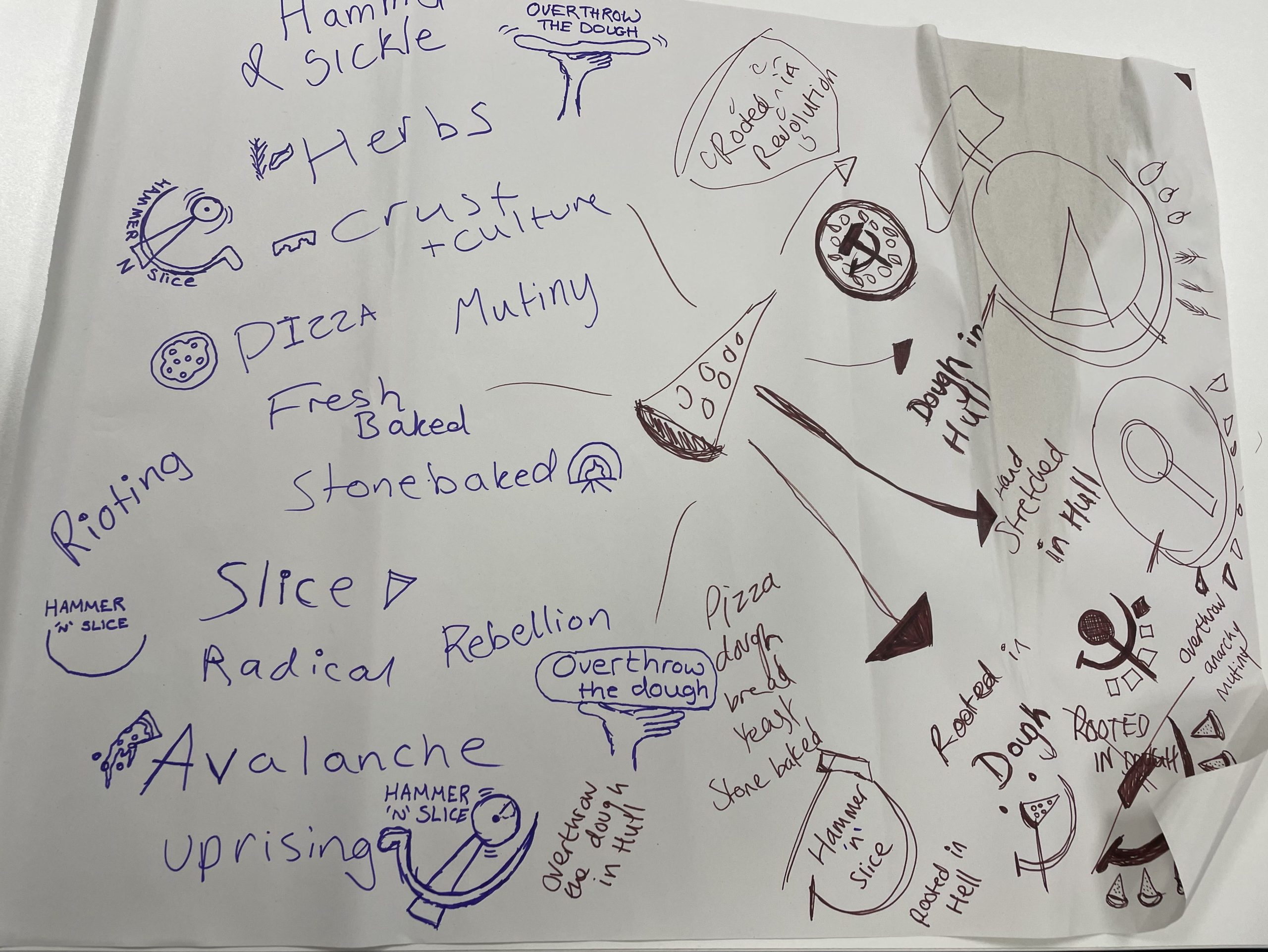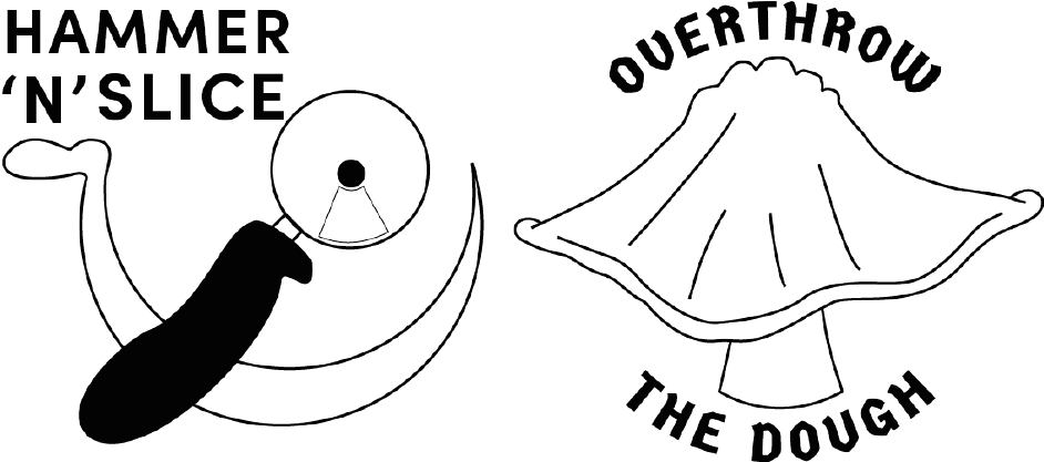 During the 2-person brainstorming session, two names were developed. The first being ‘Hammer ‘N’ Slice’ and the second was ‘Overthrow the Dough’. Rough sketches of logo designs were also created. These names and logo ideas were then taken and digitally evolved, used across the flyer designs and pizza packaging designs.